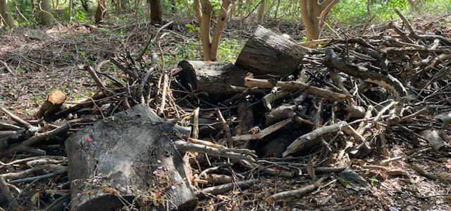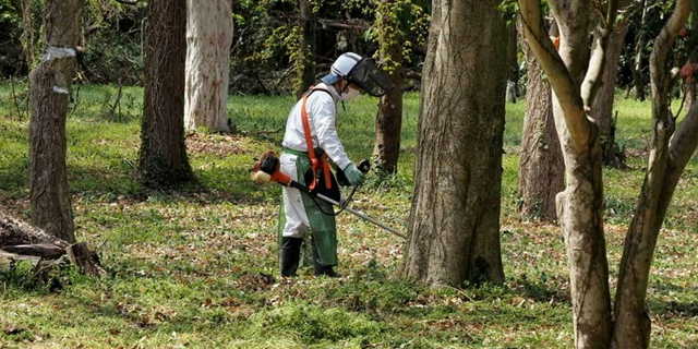 混み合う木々は 梯子を昇り鋸で枝を刈り、或いは チエンソーで切り