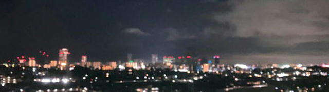 (煌々と輝くマンション群に比べ赤色灯点滅する商業ビル群の