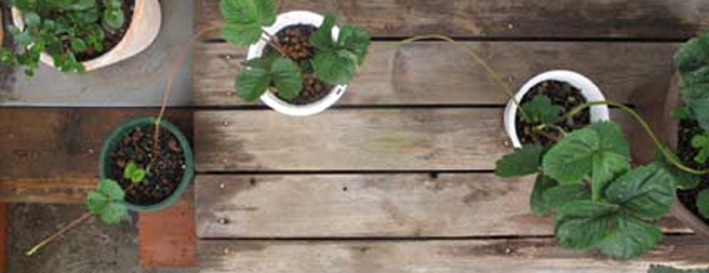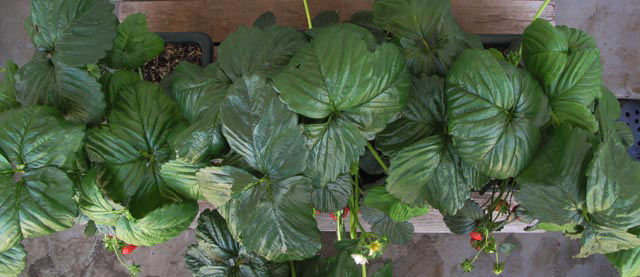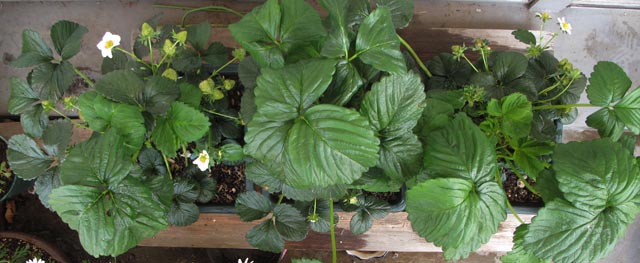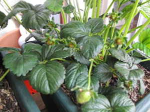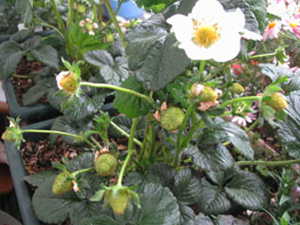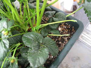 | 肥料補充を兼ね株を点検、太郎株のランナー一本を確認切除する。 |