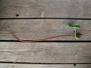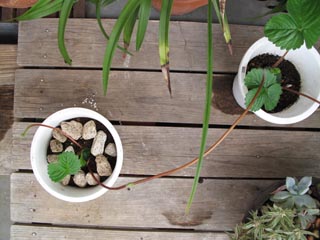 子株(栽培株)採取 1)親株が複数ある場合は、最も成績がよかった株から子株を採る 2)健康なランナーを選ぶ 3)子株を複数鉢上げし、成長経過を観察して栽培株を選ぶ