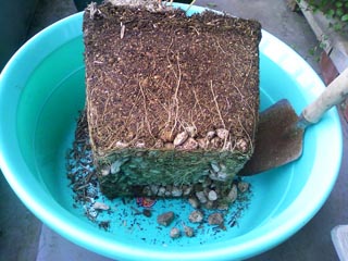 広げた状態で新しい用土にのせて周囲に用土を詰める方法を採りました。