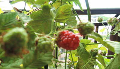 ベランダのブラックベリー色付く