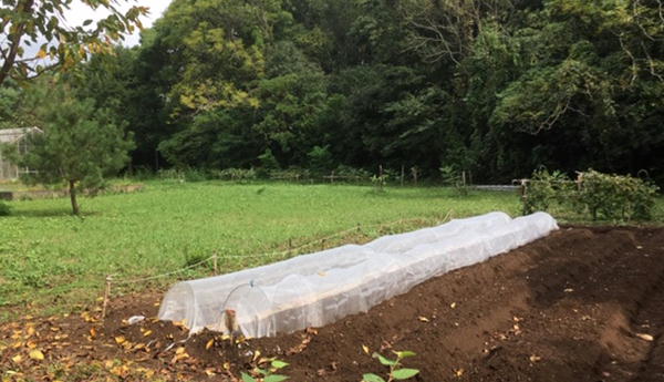 白いネットのなかには大根が、その左畝には菜花、真ん中の
