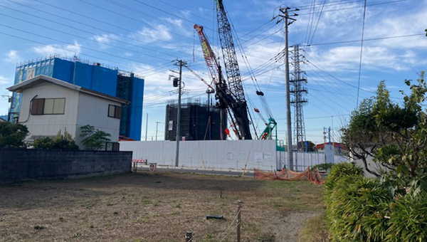 バブル弾けて幾星霜 建築シートに居住者募集の垂れ幕揺れ