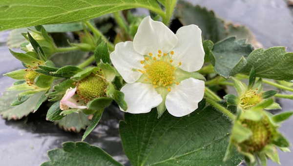 彼方でグリーンピースの花が 此方でイチゴの花が咲き誇り
